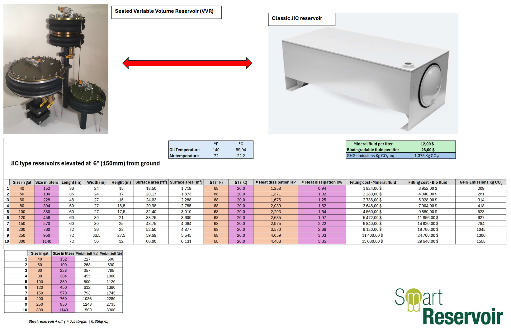 Many systems are currently designed with oversized reservoirs as they are believed to act as oil cooler. Conventional reservoirs do cool oil but minimally. Today's high performance coolers can perform all the cooling requirements by themselves while being light and compact. A properly sized coolers will keep the system temperature within the desired range whatever the environment. Traditional reservoir requires appropriate differential temperature ratio between oil and ambient air to perform in that matter and even so, their cooling capacity is modest at best. The following example shows the relative limited cooling capacity of conventional reservoirs vs. coolers.